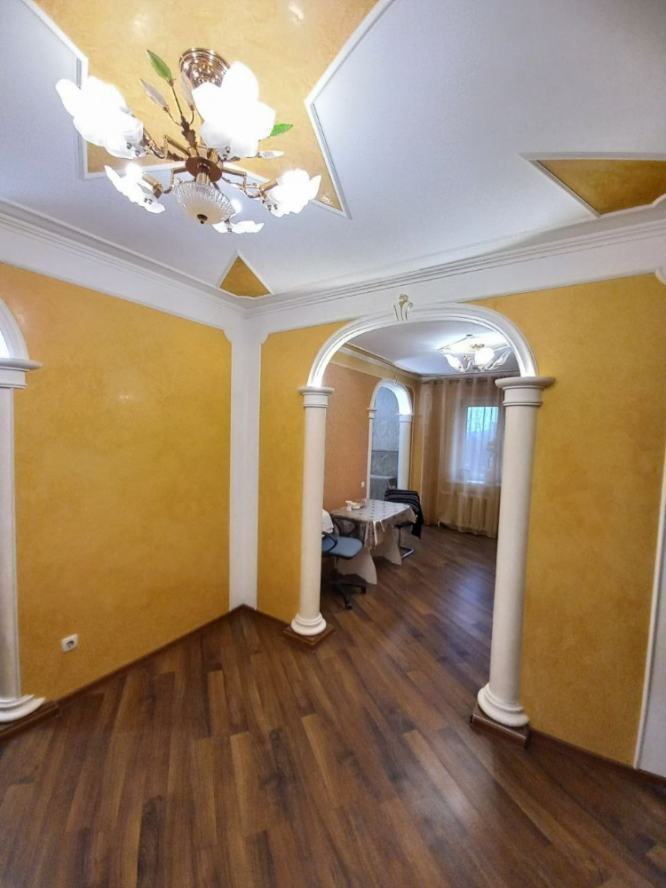 Квартира на Цусимской, 85 — простор и комфорт в Калининском районе ДНР В самом зелёном районе города продаётся светлая и уютная четырёхкомнатная квартира. Здесь вас ждёт гармония и спокойствие благодаря хорошей энергетике пространства. Две трёхкомнатные квартиры, совмещённые с разных подъездов, узаконены на один адрес. В квартире три большие комнаты и небольшой кабинет, два санузла (ванна и душевая кабина). Есть гардеробная комната и кладовая. Окна выходят на обе стороны дома. Во дворе обустроено парковочное место, а также идёт обновление детской площадки. В доме установлены кондиционеры, есть подогрев полов. На кухне установлена необходимая техника: варочная панель, духовой шкаф, посудомоечная машина, холодильник и стиральная машина. Рядом с домом есть всё необходимое для комфортной жизни: детский сад, школа, остановки транспорта, кафе и рестораны, супермаркеты и ТРЦ.