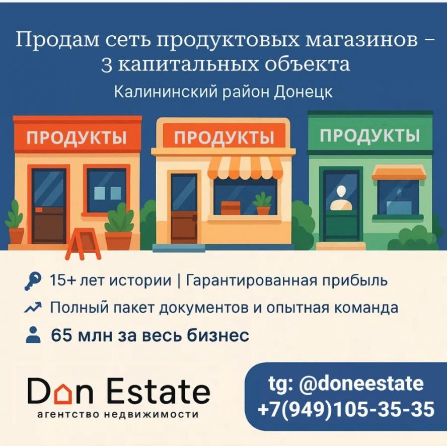 Продается сеть продуктовых магазинов в Донецке Уникальная возможность приобрести готовый и стабильный бизнес с многолетней историей. Наша торговая сеть успешно работает более 15 лет и зарекомендовала себя на рынке. Включает три магазина, расположенные в местах с высокой проходимостью. - Два магазина в Калининском районе. - Один магазин в Ленинском районе. Характеристики объектов: 1. Площадь: 122,3 м2, Земельный участок: 419 м2. 2. Площадь: 91,9 м2, Земельный участок: 253 м2. 3. Площадь: 159,1 м2, Земельный участок: 487 м2. Преимущества: - Стабильность и доверие покупаей. - Удобное расположение с развитой инфраструктурой. - Готовый бизнес под ключ с лицензиями и товарными остатками. - Устойчивый доход и потенциал для развития. Цена: 62 500 000 рублей, включая оборудование, товарные остатки и лицензии. Возможна продажа всей сети или отдельных объектов. #Донецк #продажа #бизнес #продуктовыймагазин #коммерческаянедвижимость #готовыйбизнес