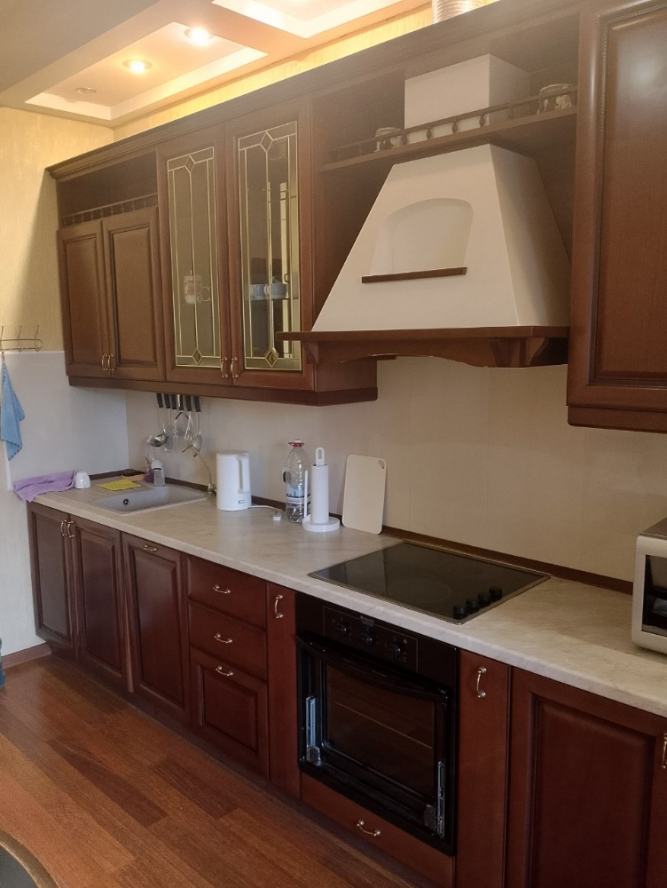 просторные и светлые комнаты с удобной планировкой; все окна выходят на южную сторону, зимой в квартире тепло; квартира в хорошем состоянии, укомплектована встроенной мебелью и техникой; есть два раскладных дивана, много шкафов, достаточно места для хранения вещей; уютная кухня-студия со встроенной техникой; просторный санузел; тихий двор, закрытый чистый подъезд, тамбур на две квартиры, спокойные соседи.