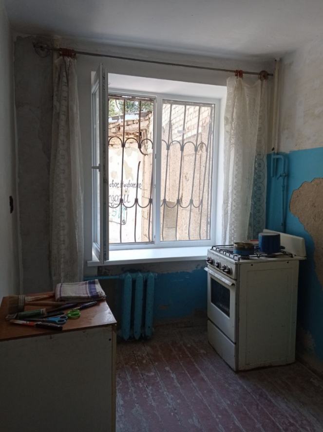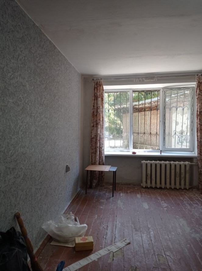 Продаётся комната в общежитии в Киевском районе ДНР, на пятом участке, недалеко от остановки Очаковская. В блоке три комнаты, но соседей нет. В комнате есть мягкая мебель, шкафы (стенка) и телевизор. В блоке также есть холодильник и стиральная машина. Туалет и душ общие на блок. Кухня с двумя электрическими плитами тоже общая на два блока. В комнате есть свет и отопление, но вода подаётся по графику.